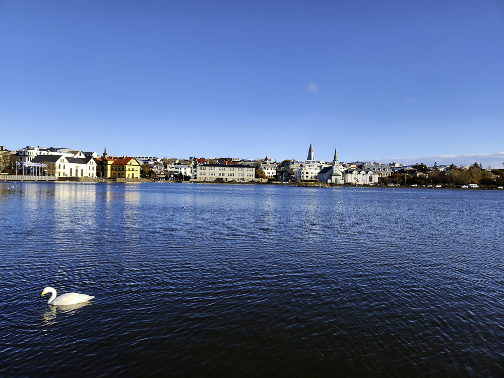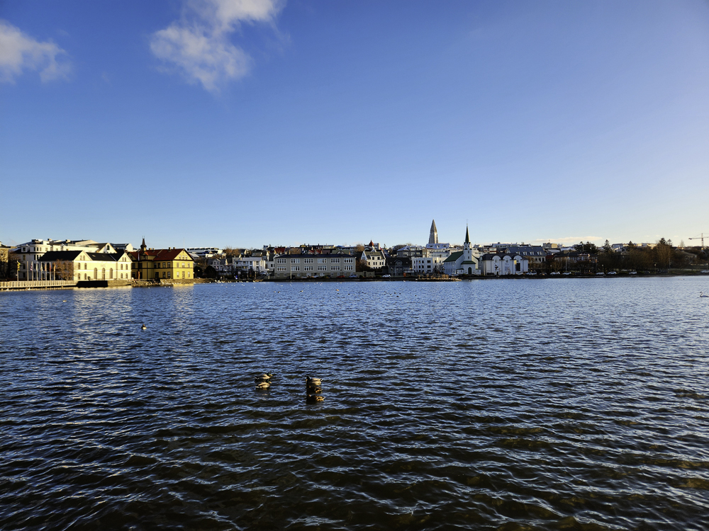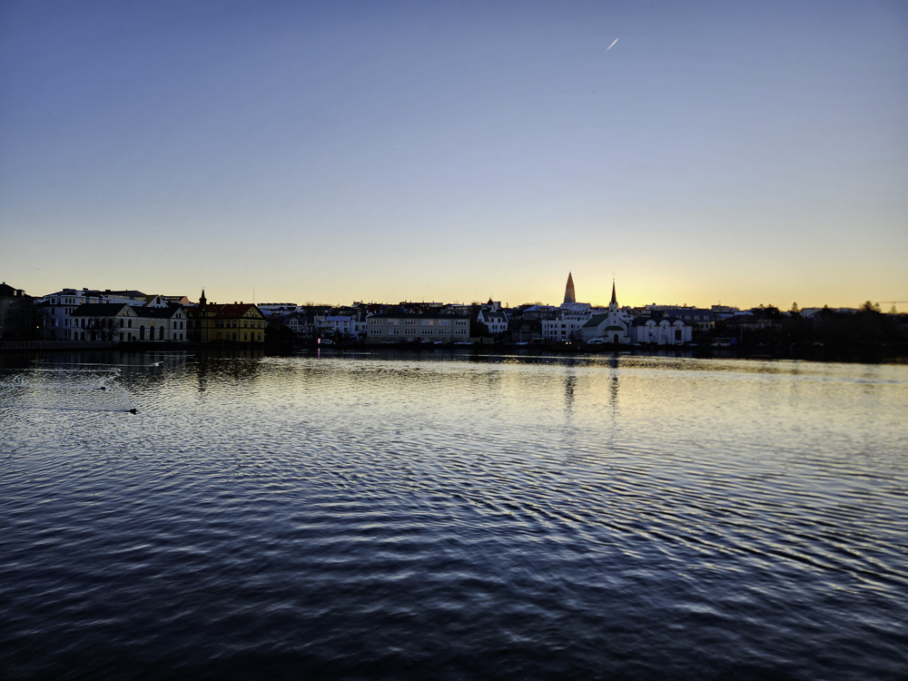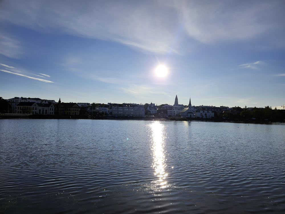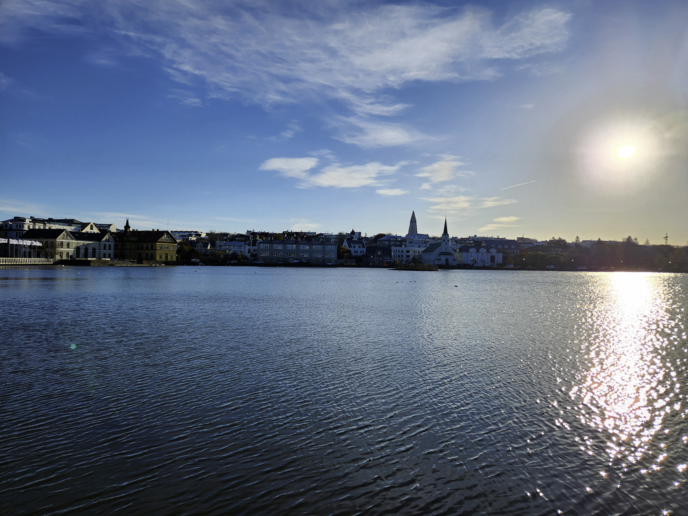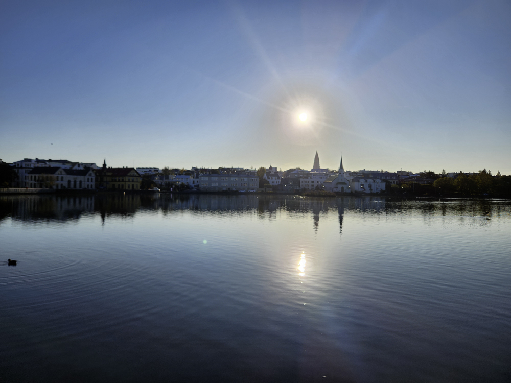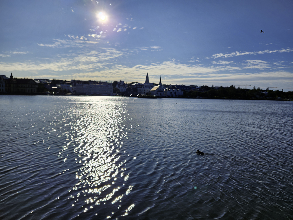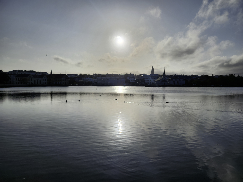 The Photo: On a warm sunny day in 2017 Kathleen and I took a walk through Reykjavik. We lingered around Tjörnin and took pictures. It was a lovely day. When we got home and looked at those photos one stood out and we liked it so much we had the photo made into a canvas that has hung in our living room for the past several years. We love that photo and we get a lot of complements on it. Little did I know that I would pass that spot every day on my way to work at Háskóli Íslands.